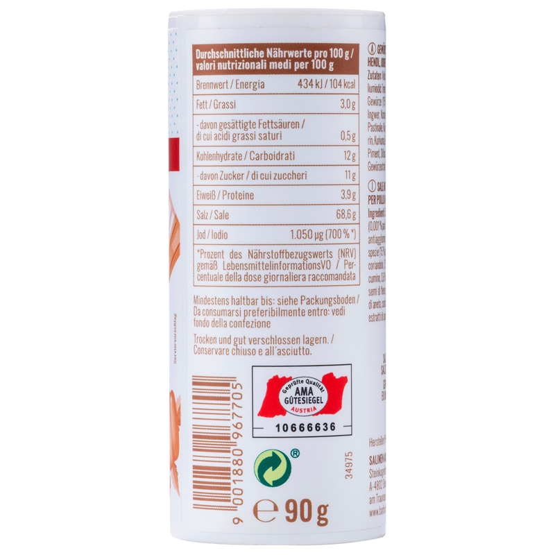 BAD ISCHLER Brathendl Salz im handlichen Streuer verfeinert mit Kurkuma, Piment und Kardamom Ihren Geflügelgerichten einen unverwechselbar, köstlichen Geschmack und passt auch wunderbar zu Kartoffelgerichten, Gegrilltem, Pommes und Gulasch.